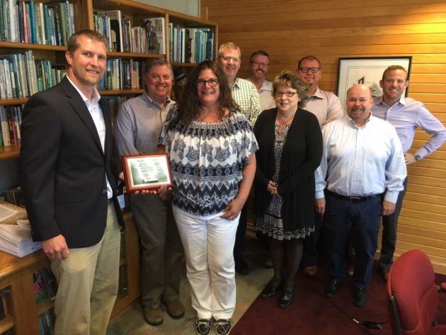 Jon Lee (Accident Fund) and agent Judi Heath (HUB International) present a 2018 WorkSafe Award to Sue Howard and the Regional Management Team at Goodrich Quality Theaters.